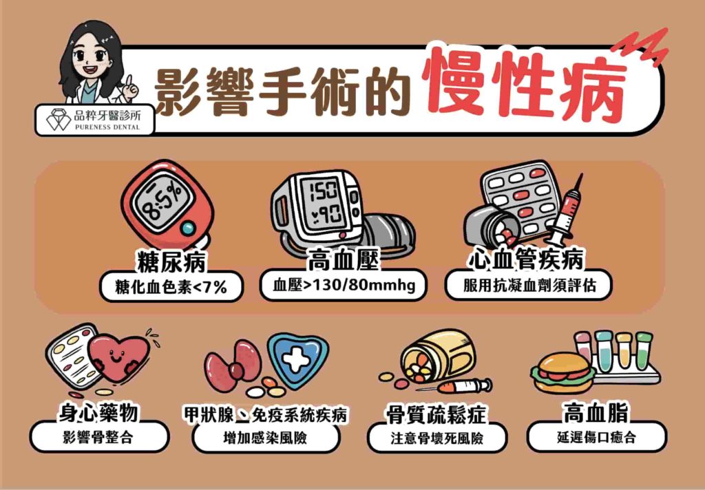 慢性疾病控制狀況、用藥情形以及生活習慣,都可能影響傷口癒合與骨整合過程。因此,術前提供牙醫師完整病史,是確保安全與成功的重要步驟。