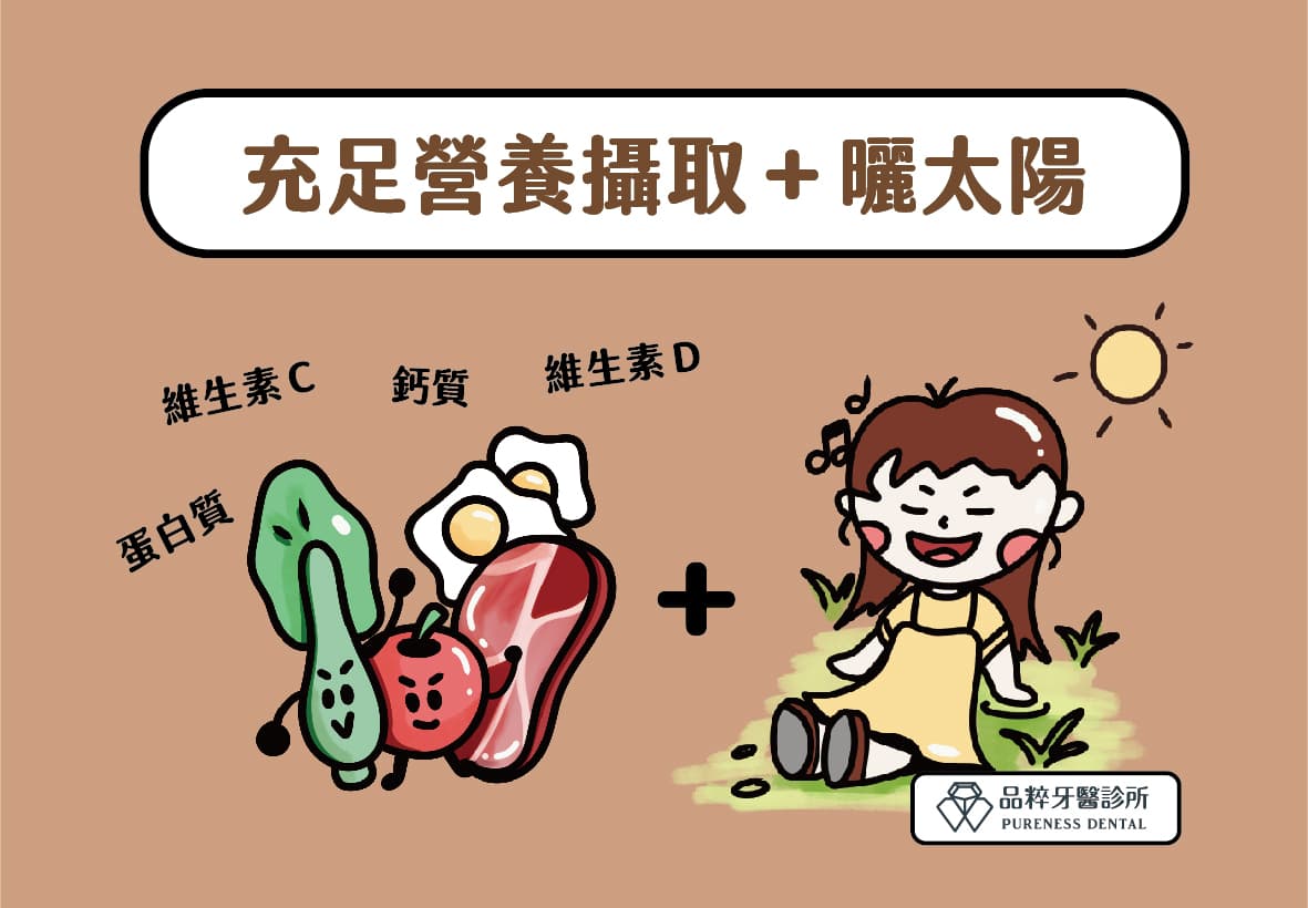 - 維生素D3:建議即日起補充,每人每日1000~2000IU,40歲以上合併鈣片1000mg,加上每日接觸陽光15~20分鐘,可以提升植牙與補骨成功率。